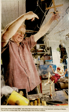 In his spare time, Kluge hangs out in a cluttered corner of his basement, surrounded by woodworking tools, doll eyes and an eclectic collection of odds and ends acquired from antique shops, out-of-the-way spots and hardware stores. A tiny white fetching bandeau is stashed in one drawer; colorful insects hang from a hook a short distance away.
